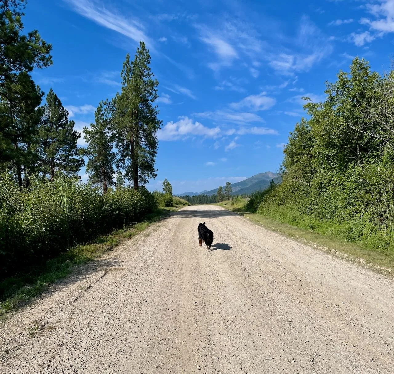 This is Pozy enjoying a morning walk on our road.