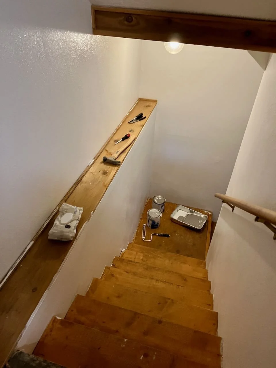 I had enough paint to “cut in” all the edges before the carpet went down, and so I did that — you can tell if you look at the landing. That will at least make it easier (and safer) to paint with the carpet already laid.