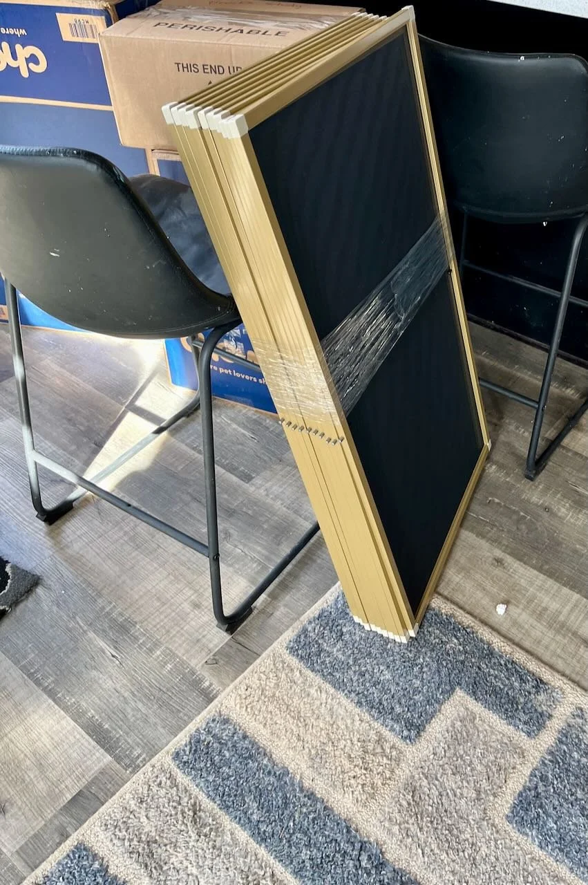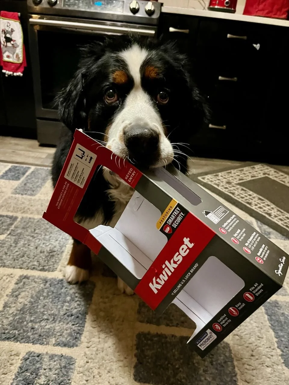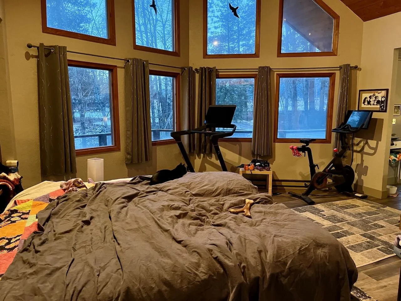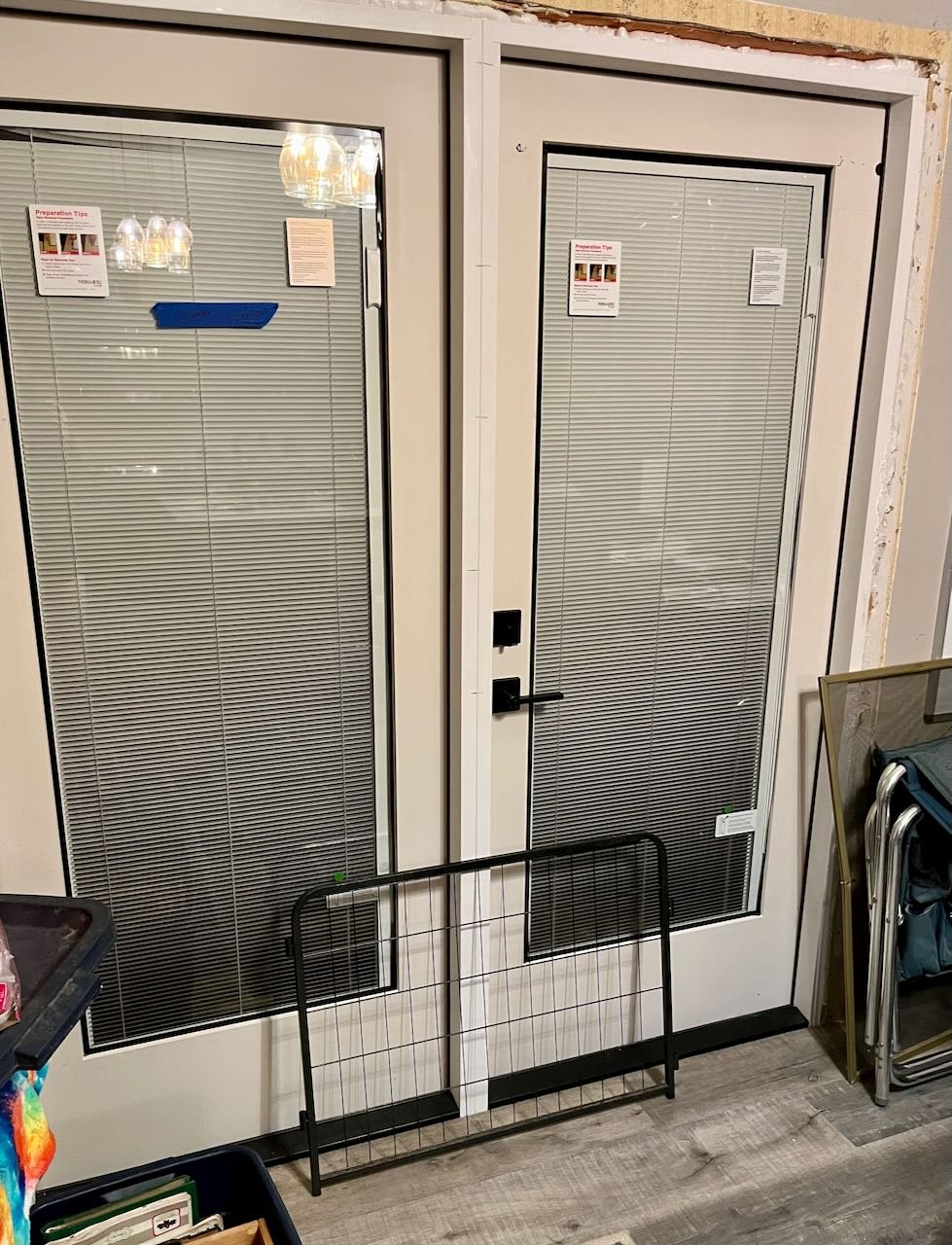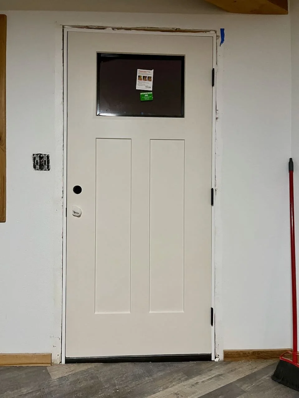But the living room will soon be back to it’s primary functions — gym and dog training space — because the third coat of paint will go on in the bedroom today. Check out how great the new bedroom door looks!