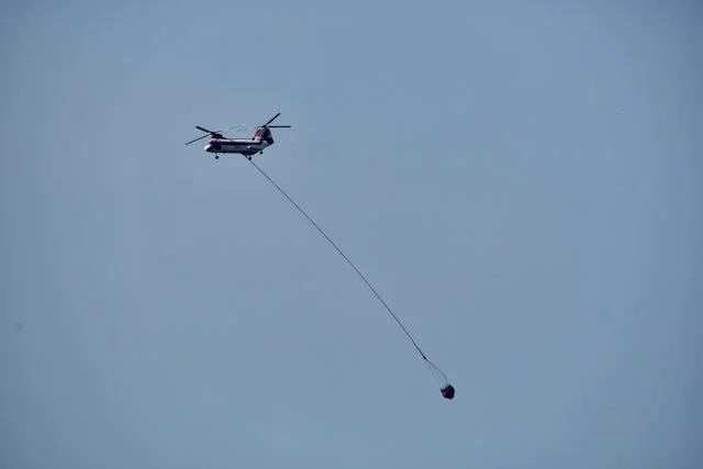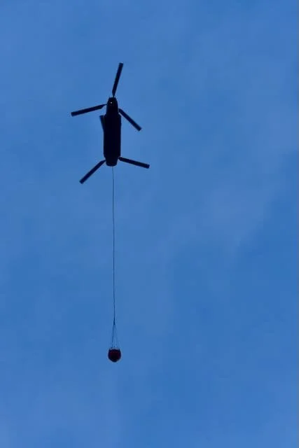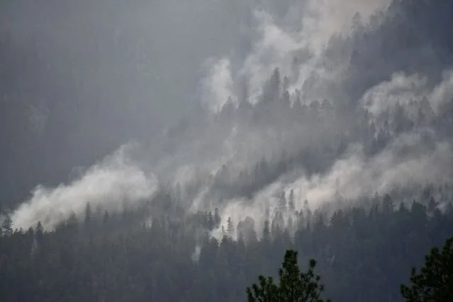 The fire continues to burn — this is from last night and watch for the lightening, which I just happened to catch.