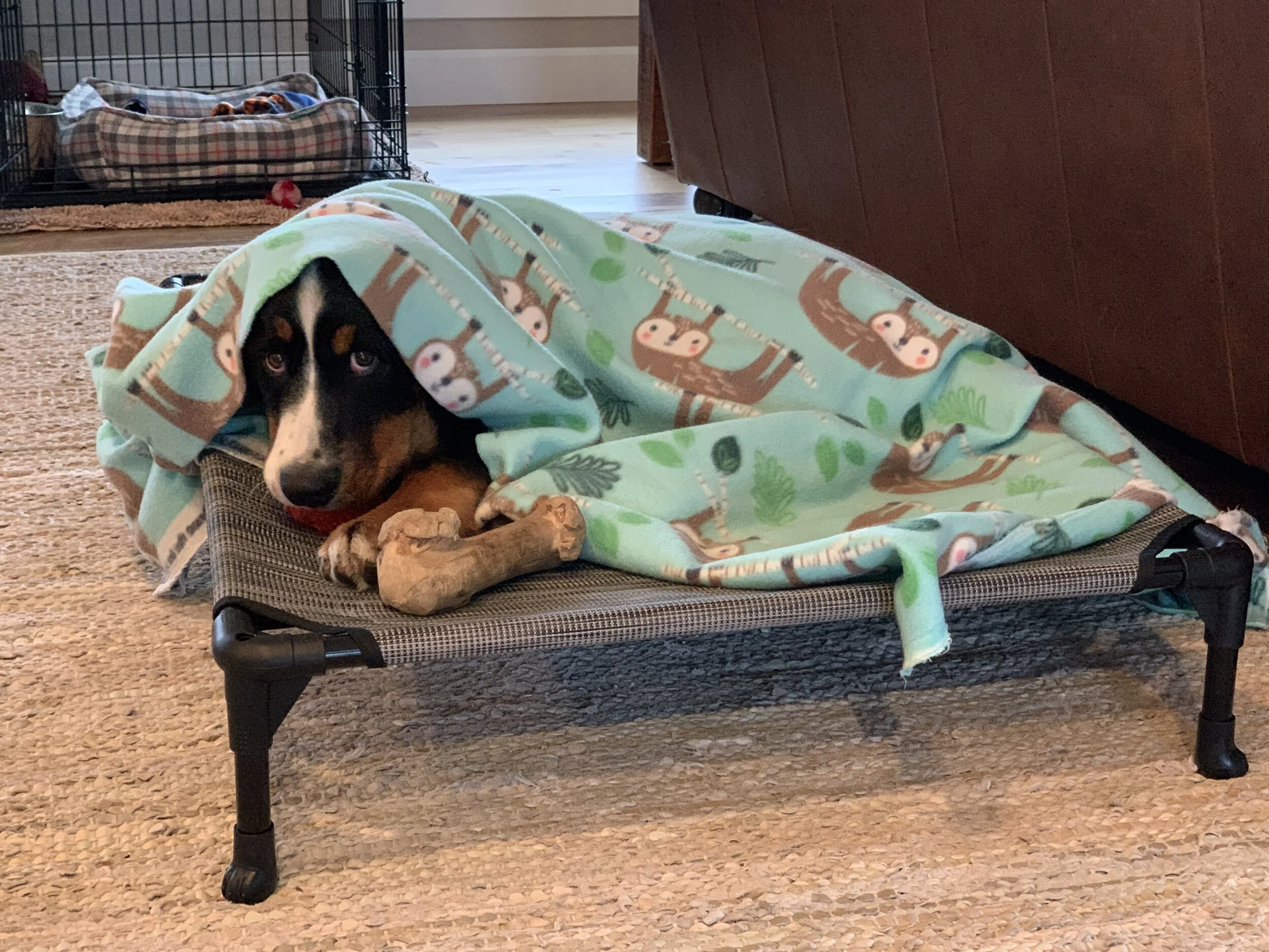 Lately, I've been working on "back" and "side" which essentially is walking backwards or sideways. Back was a bit tricky, and we have just begun side, but the effort is well worth it. He is becoming an excellent box step dance partner ha ha! As for snuggle bug, I think Kjempe would like to snuggle a lot more, but he does get hot fast, so our time on the couch together lasts about 20 minutes max, and then he goes down to the cold hardwood or tile floor. I bought him a new elevated bed that he and his bestie, Gimli, seem to "fight" over.