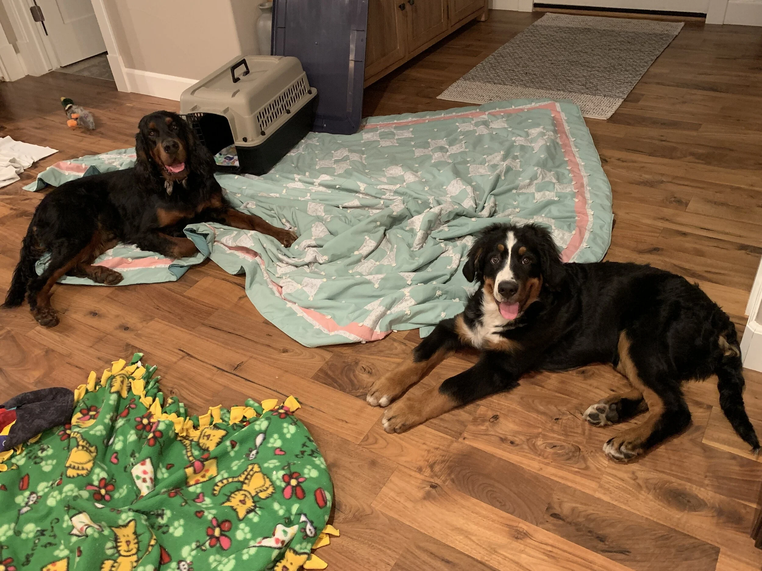 A few weeks ago, Kjempe got to spend a week with Fischer, a gordon setter that my Ex and I had together. They had to relocate to Utah, so we do not see them often. Those two had such a fun time together and Kjempe was visibly sad when they left. We hope they come back to visit soon. Looking forward to the winter season. Kjempe will start to learn age appropriate harnessing and driving tactics for Skijoring because I love to x-country ski.”