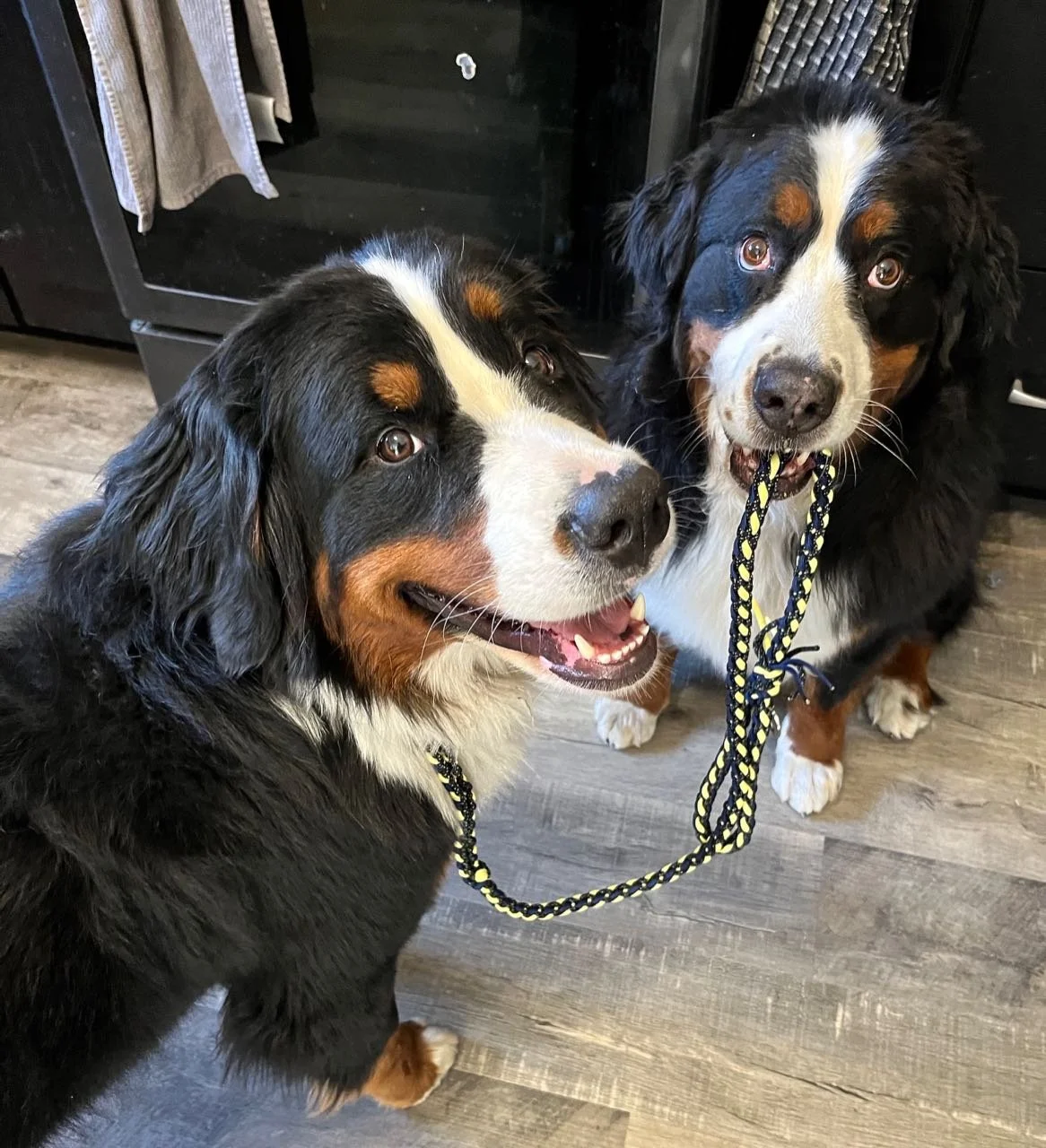 Although I will not compete with Capella in agility before she is two, I decided it was time to make her life as an agility dog special-slip-lead-official. In other words, I ordered a custom agility slip lead for her — this is Sparkle helping with the modeling…