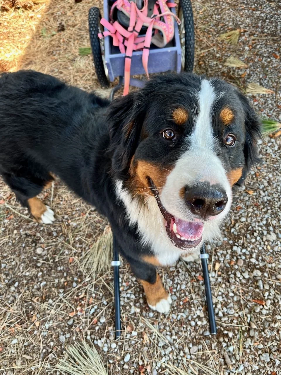 And so her draft training is slow and easy. Step One is learning to step between the shafts — and she controls the pace of things. That is how confidence happens — honoring and respecting what this particular dog needs to be successful.