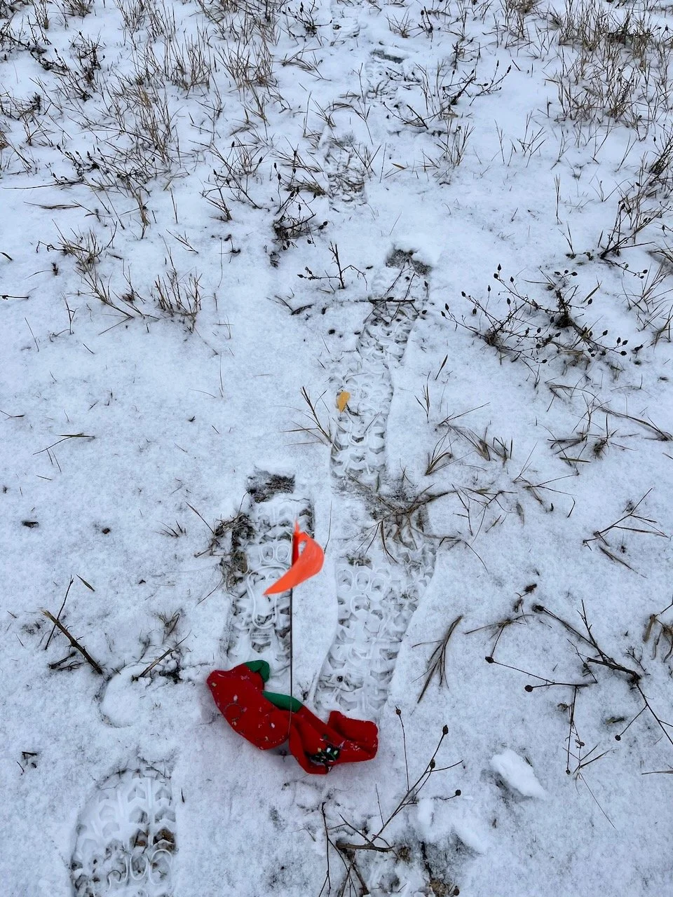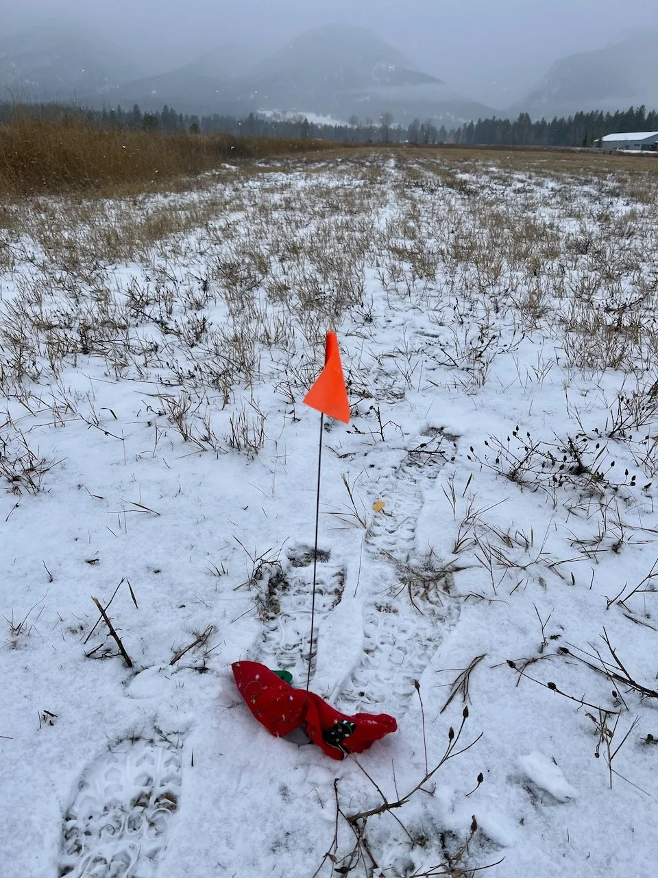 One reason I like to track in winter is because snow is a really useful tool to teaching a team to track. Not because the dog sees the steps (strangely, they don’t seem to!) but because I can see exactly where the track is, and the treats stay above the ground so are easy to “grab and go” for the dog.