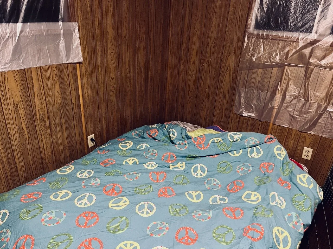Check out the comforter my sister brought over for the air mattress bed — how perfect is that?!