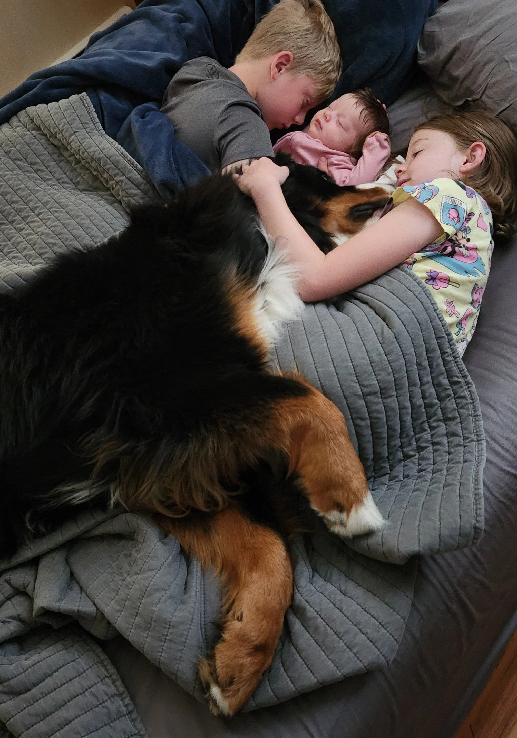 We weren't sure what Zeus would think, but we knew she'd be loved like the rest of us! She was born premature so she spent 10 days in the NICU and we brought her blankets home from the hospital for Zeus to sniff before she was able to come home. At first, Zeus didn't quite know what to think about the baby crying but almost immediately he became very protective and concerned. Whenever she cries he comes to check on her give kisses, and make sure she's OK. He checks in on her regularly throughout the day with big sniffs to make sure all is well. And now anyone driving through the neighborhood is under suspicion...and delivery trucks are definitely not welcome! window watchdog pose )
