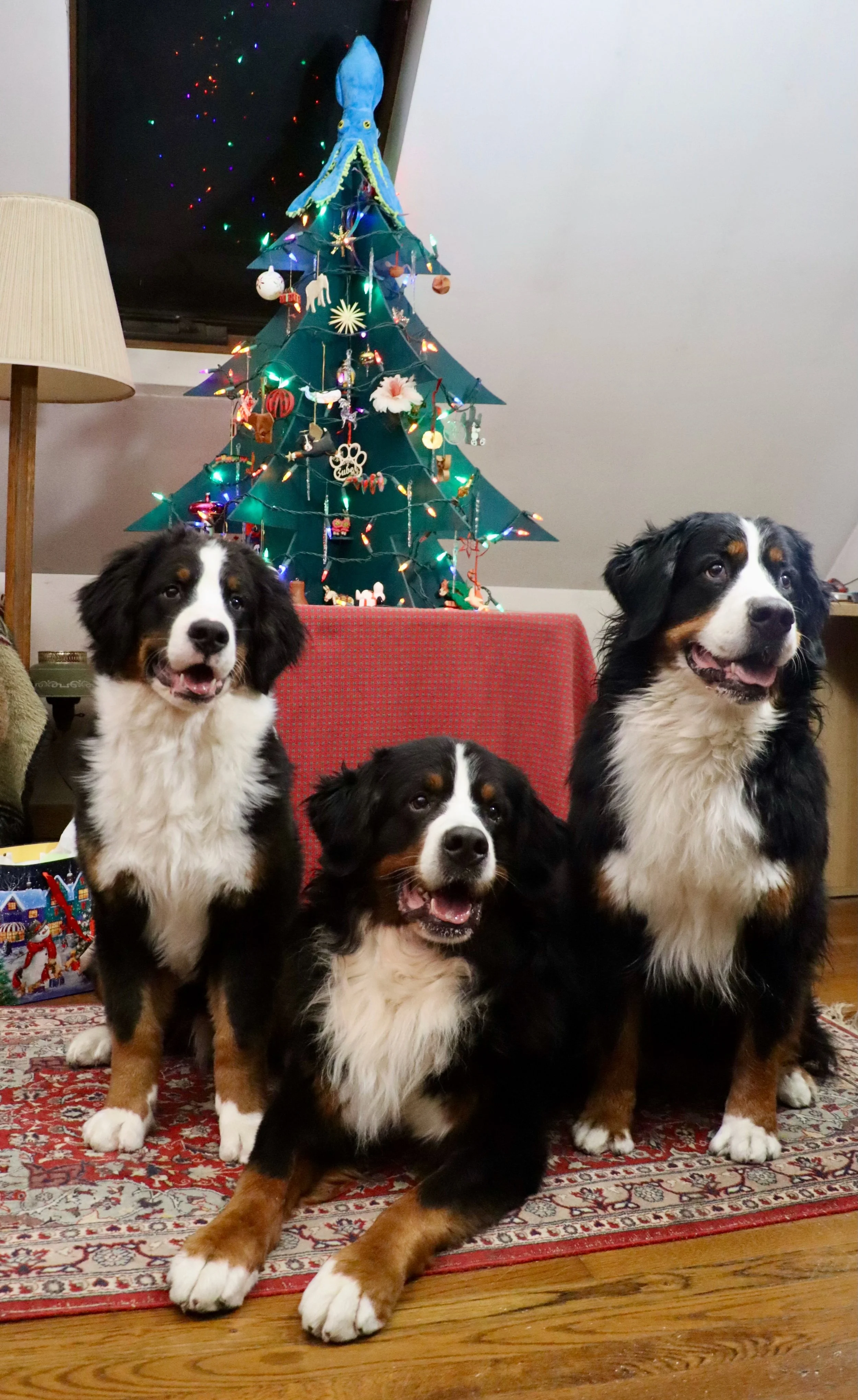 Here we have Kaibab dogs from three different litters. Baby Jasper on the one end, Uncle Zuber (Bright Stars) in the middle, and Great Auntie Kiri (newly nine Sparkler) on the other end 🎄