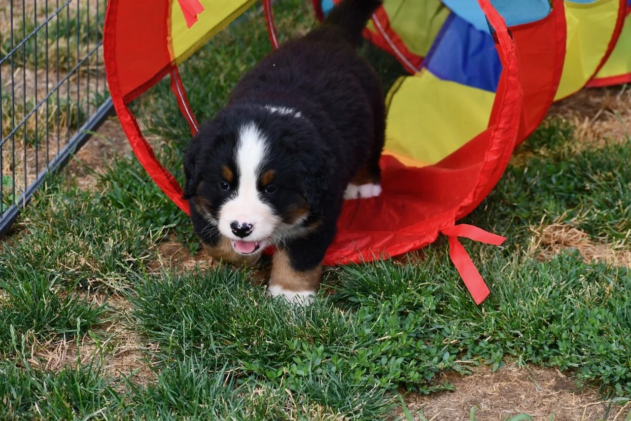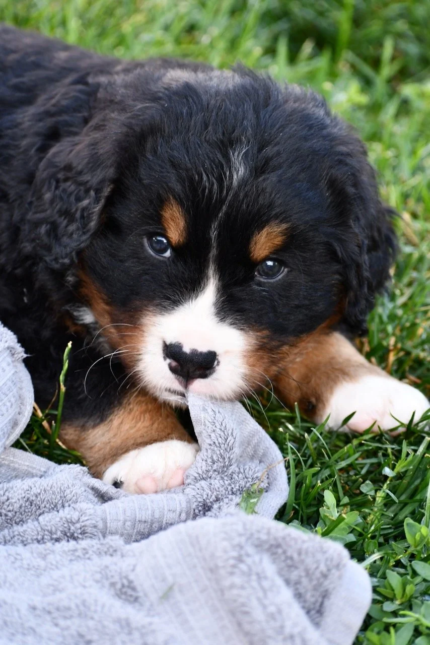 After getting him calmed down, he spent the remainder of morning outside time not moving much and just playing with things I brought to him — and the towel. Puppies find the strangest things to be really cool.