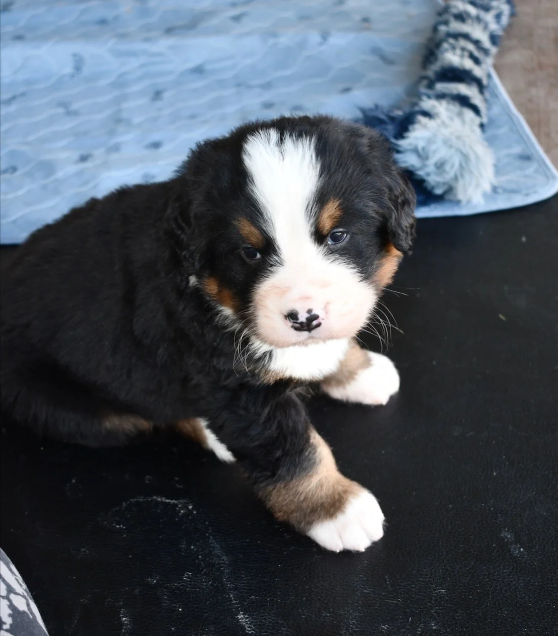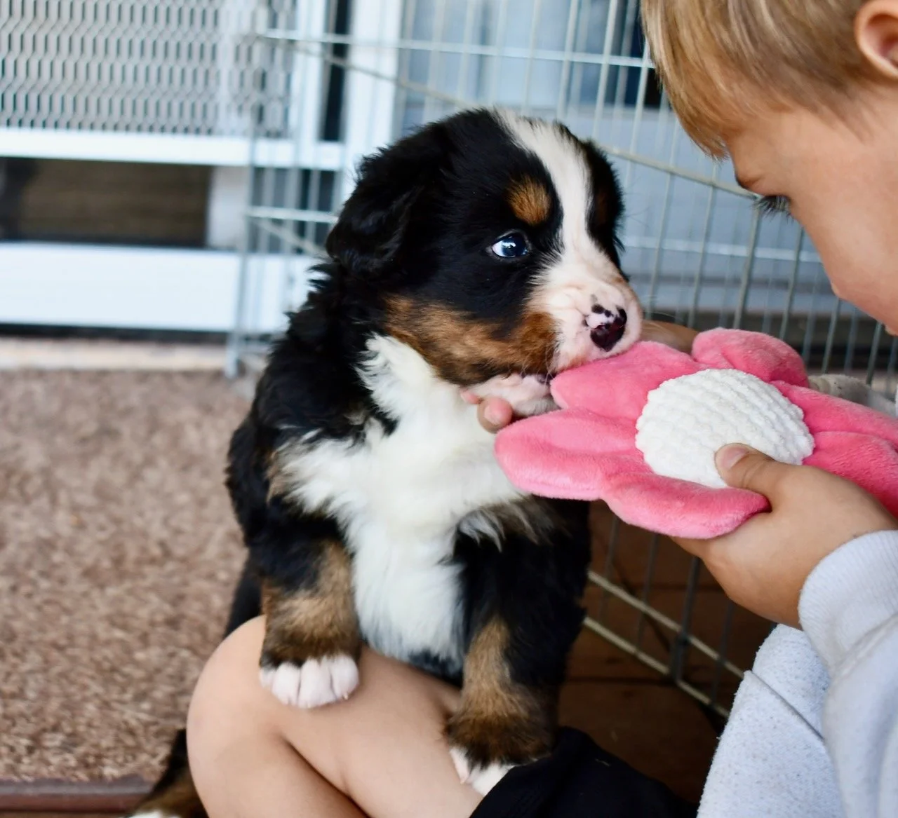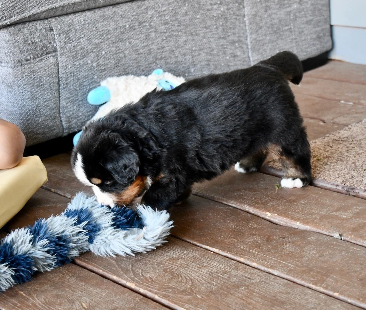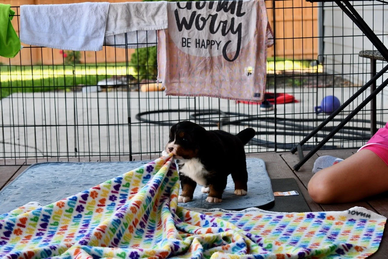 The puppies are very interested in playing tug — this is Sapphire.