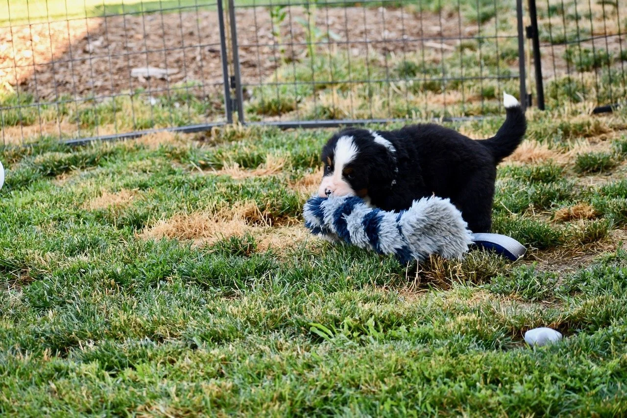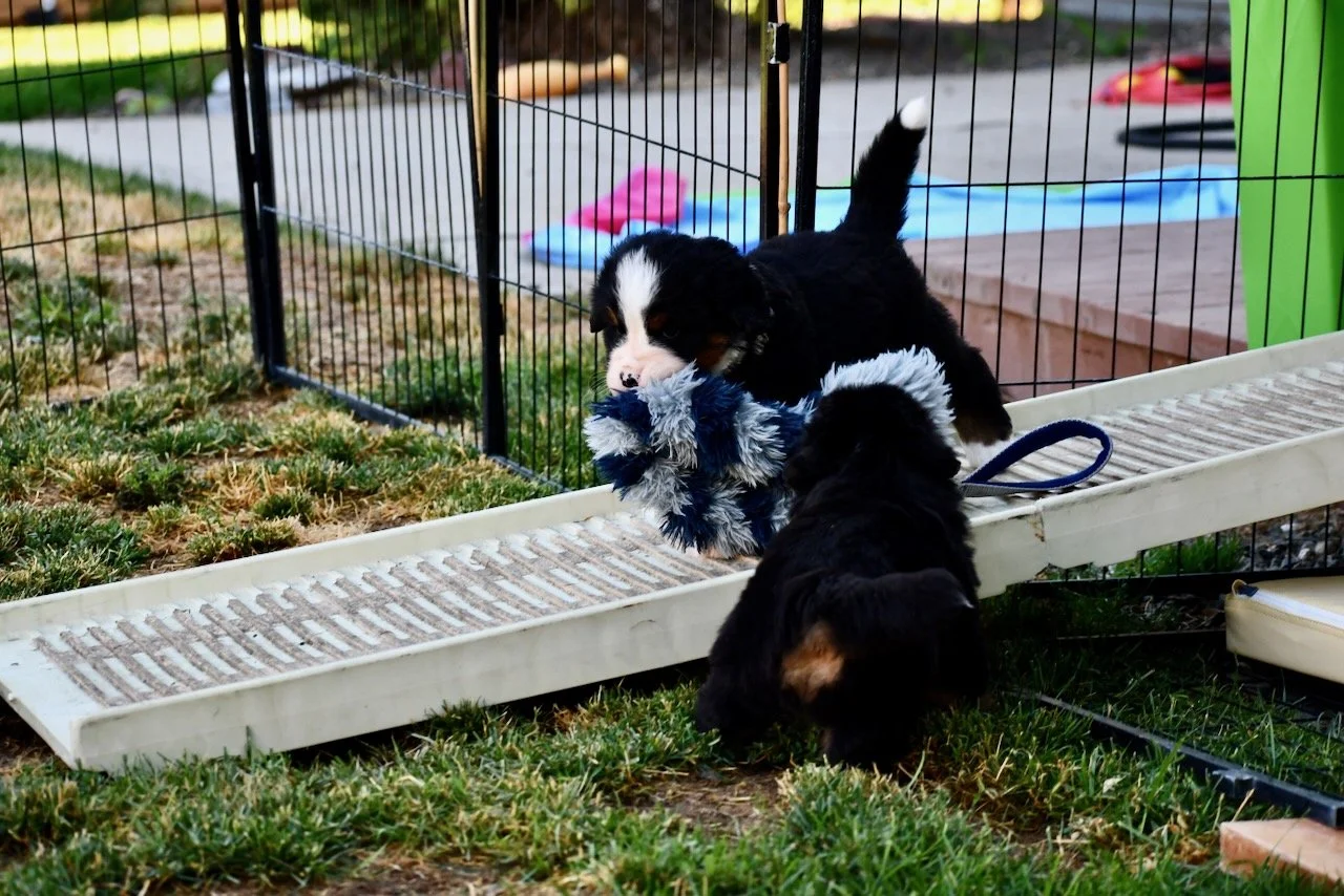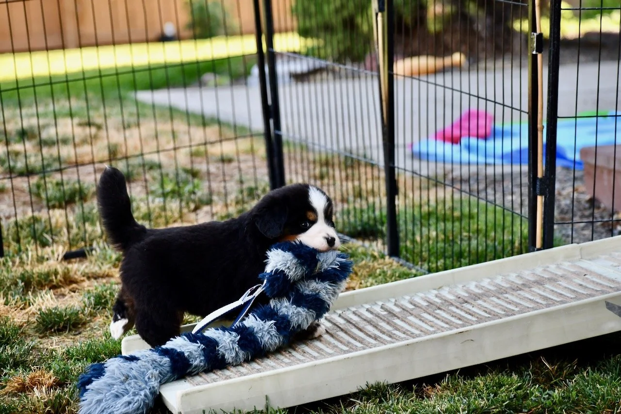 These first few photos nicely illustrate what five weeks looks like. Jasper decided a long, fluffy tug toy did not belong on the deck and so he carried it from the deck and down the ramp.