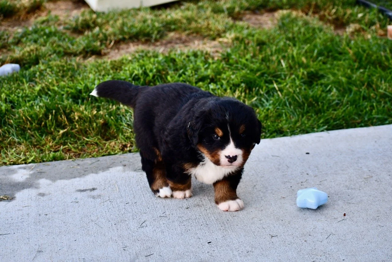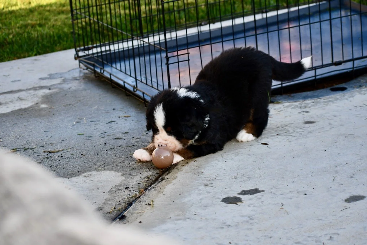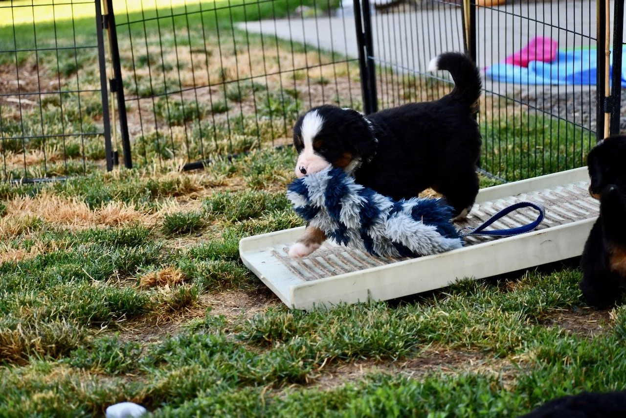 These first few photos nicely illustrate what five weeks looks like. Jasper decided a long, fluffy tug toy did not belong on the deck and so he carried it from the deck and down the ramp.