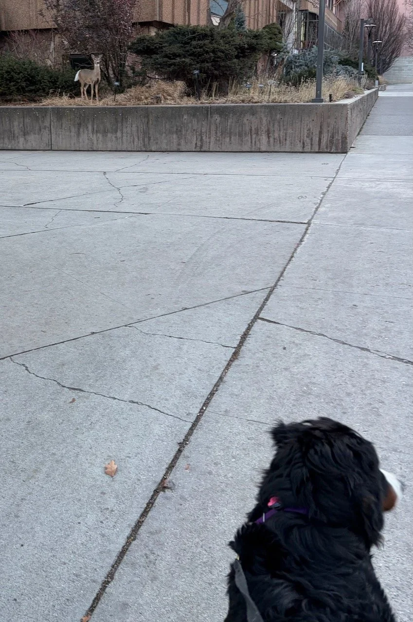 This morning —very early — I took Starry to campus to track. She did 440 yards and four turns (all on non-veg surfaces) — it was so fun to be training a dog there again. Here are some pictures from our walk back to the car through campus.