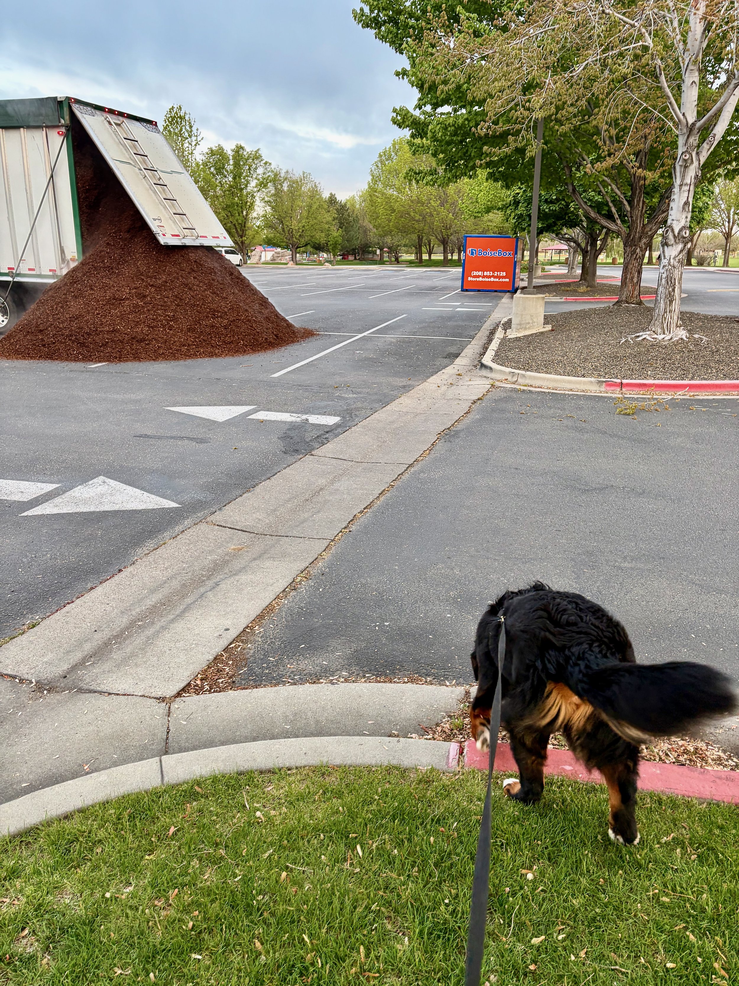 As I was walking back to the car to get Starry to run the track, a giant truck arrived. It drove across my track, taking out a big branch, and then stopped to unload mulch.