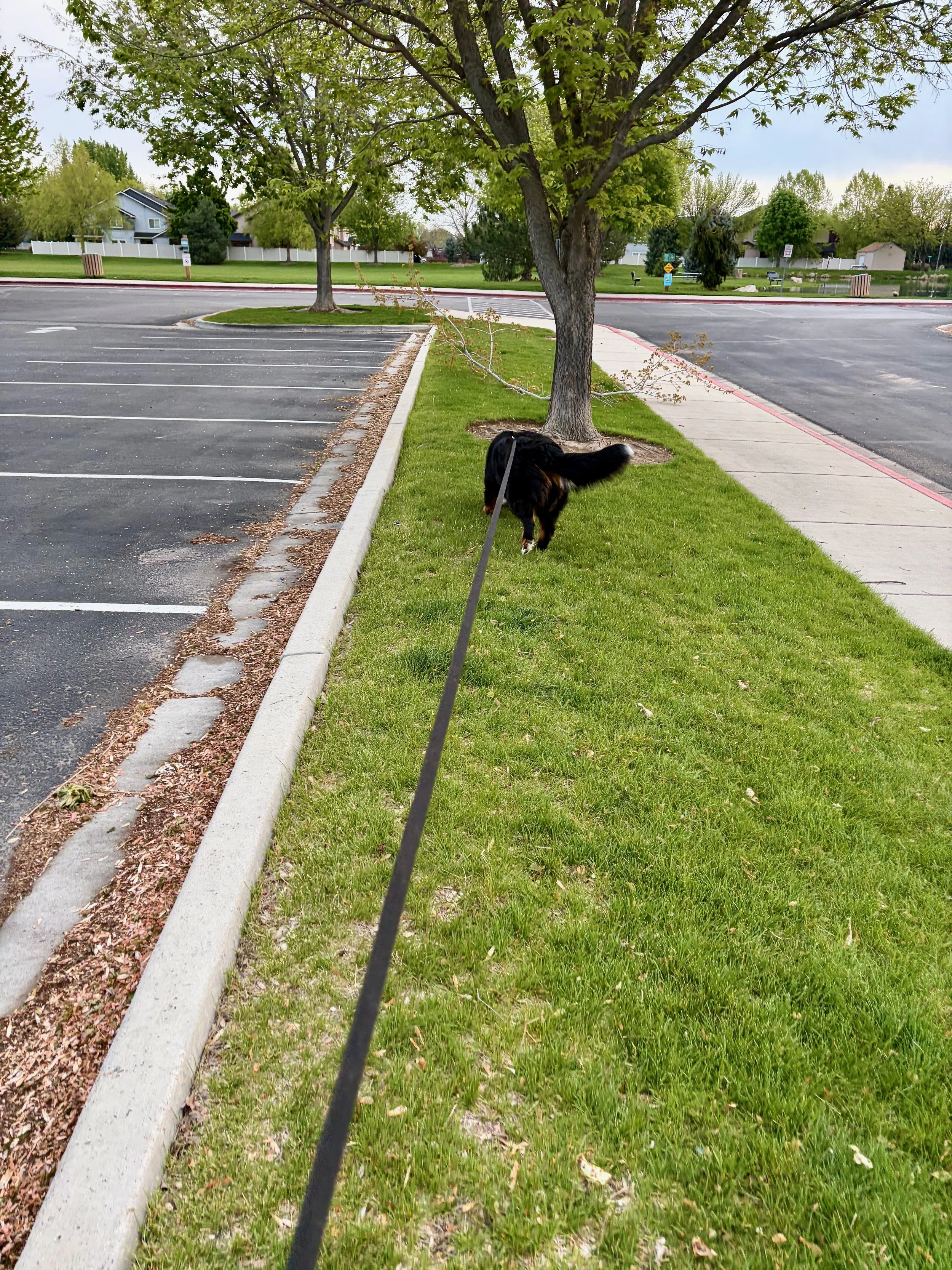 She hopped over the branch (and the treat) and continued on to the corner, which was a left turn across the parking lot to the series of islands.